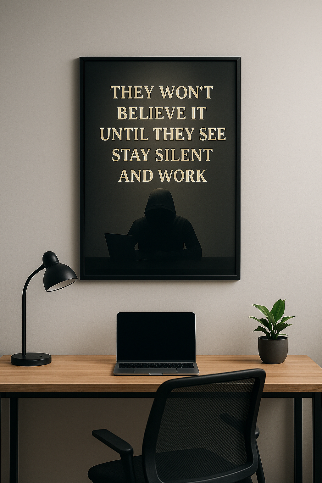 This piece exists to turn that weight into fuel. It’s a reminder that you don’t owe anyone speeches, updates, or proof in advance. Your job is simple: stay silent, do the work, and let results speak louder than any promise, plan, or argument. Every time you look at it, it pulls you away from talking about what you’ll do and back into actually doing it.